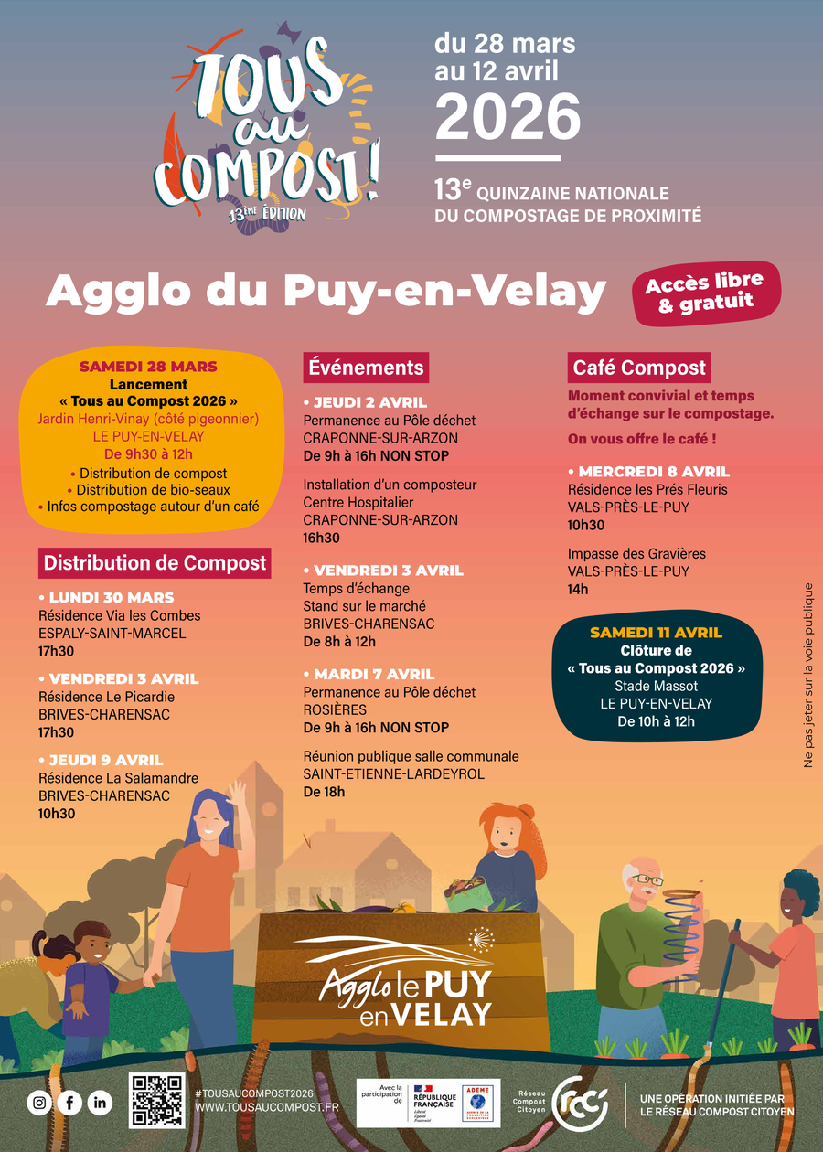 Dans le cadre de l'évènement national TOUS AU COMPOST 2026, une permanence est proposée au pôle déchets de CRAPONNE (locaux techniques ex-SICTOM - Route d'Arlanc vers Caserne SP) par le service déchets de la Communauté d'agglomération du Puy en Velay