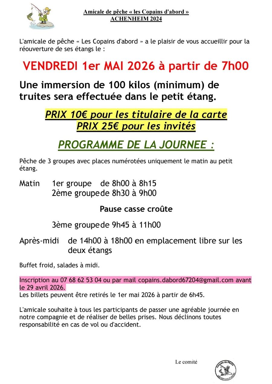 L’Amicale de pêche « Les Copains d’abord » vous invite à la réouverture de ses étangs le vendredi 1er mai 2026 dès 7h00 avec immersion de truites et journée conviviale – toutes les informations sur l’affiche ci-dessous.