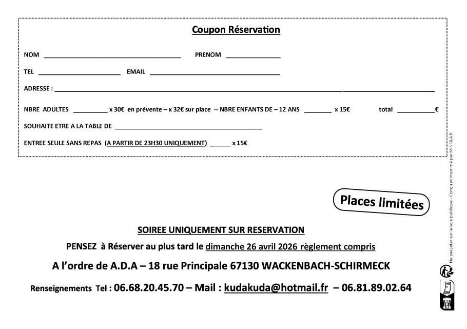 Pour le samedi soir, il vous est proposé d'acheter votre place auprÚs des membres du club ou lors des préventes du 29 mars au 17 avril.