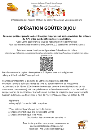 Comment commander en ligne : Via notre boutique HelloAsso à cette adresse : https://www.helloasso.com/associations/ape-du-sentier-botanique/boutiques/vente-madeleines-bijou