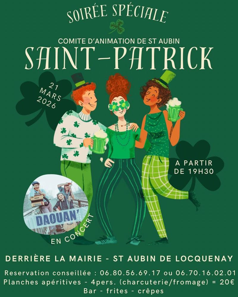 Nous n’aurons pas de fête du village cette année car la commune accueillera le festival Kikloche. Nous avons donc décidés d’organiser quelque chose de nouveau laaaaaa : ST PATRICK 🍀