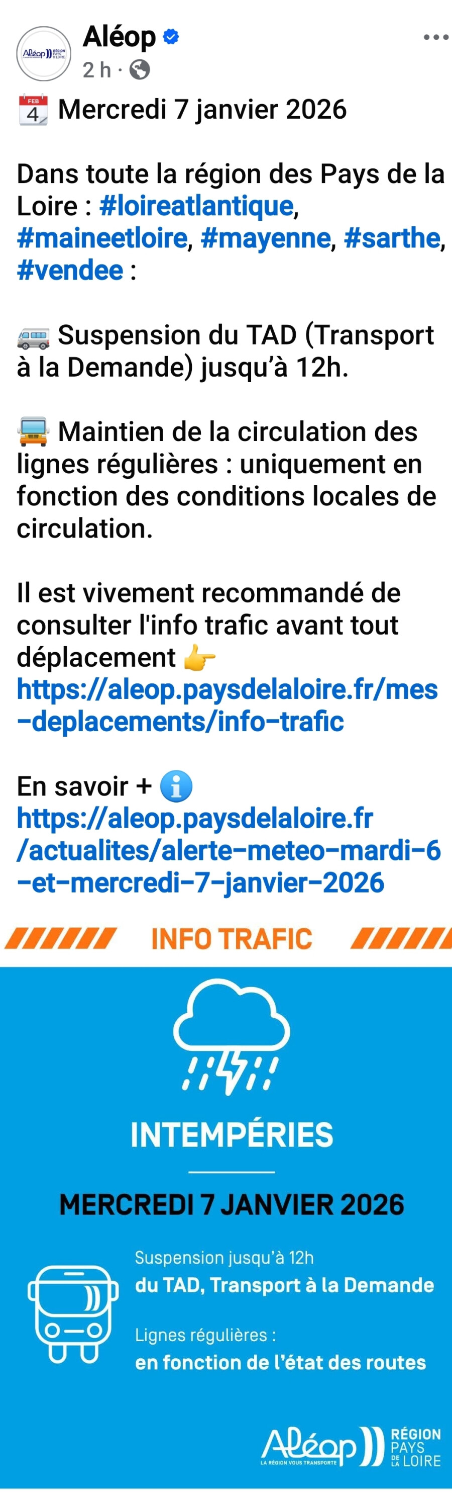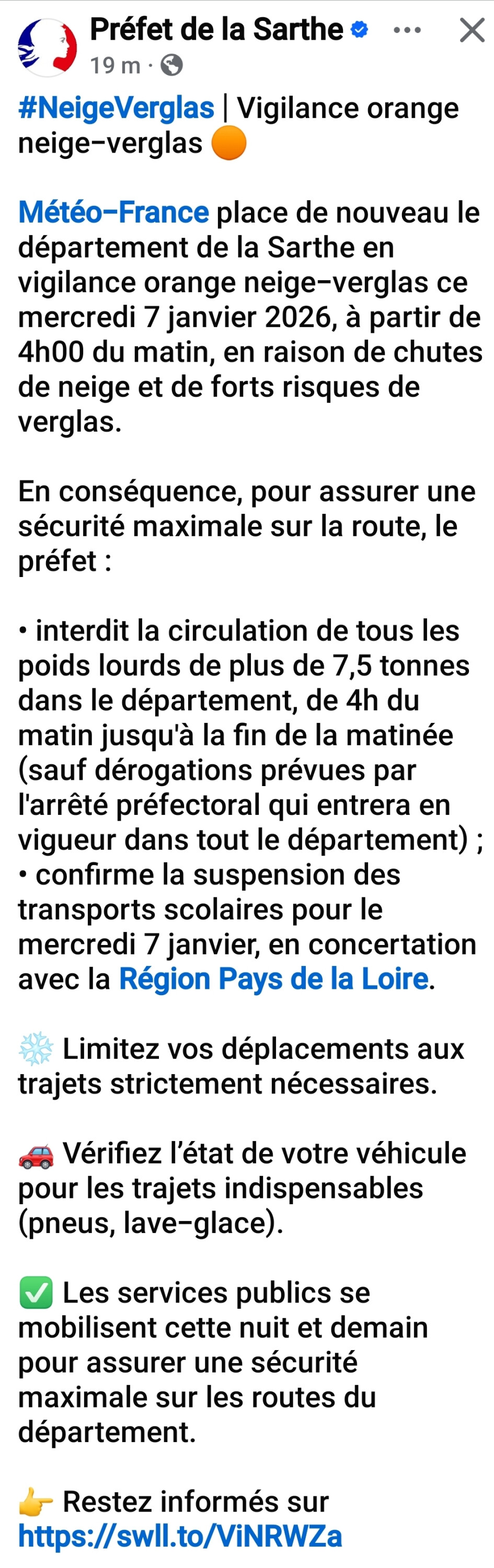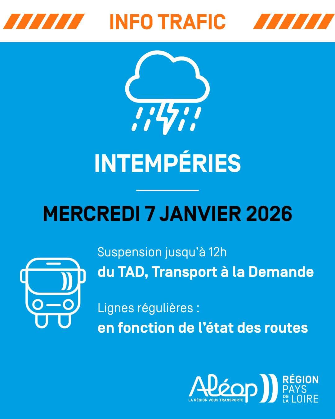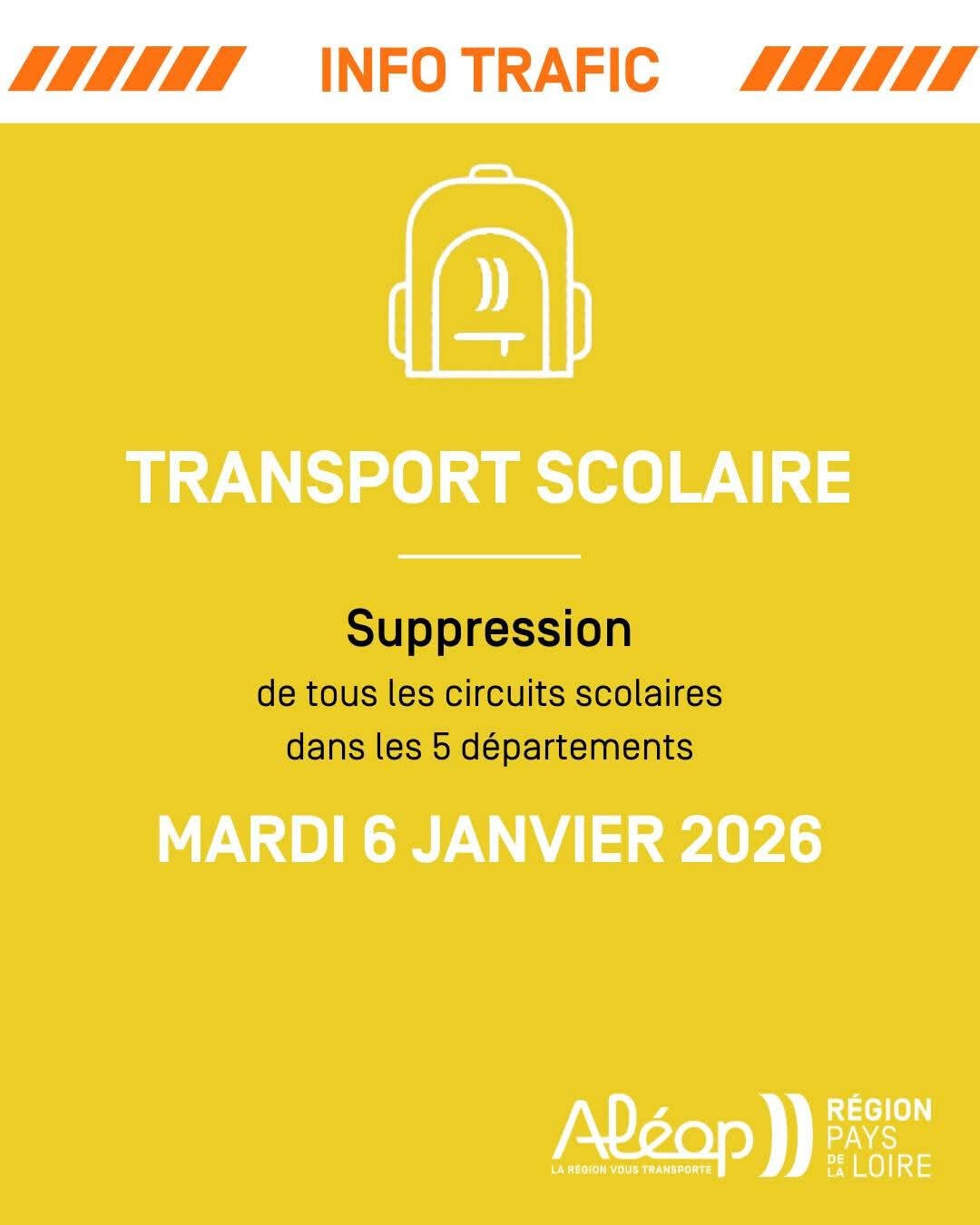 • confirme la suspension des transports scolaires pour le mercredi 7 janvier, en concertation avec la Région Pays de la Loire.