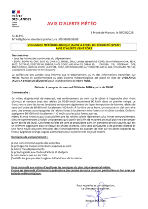 La préfecture des Landes nous informe qu'au vu des informations transmises par Météo France, le département est placé en état de