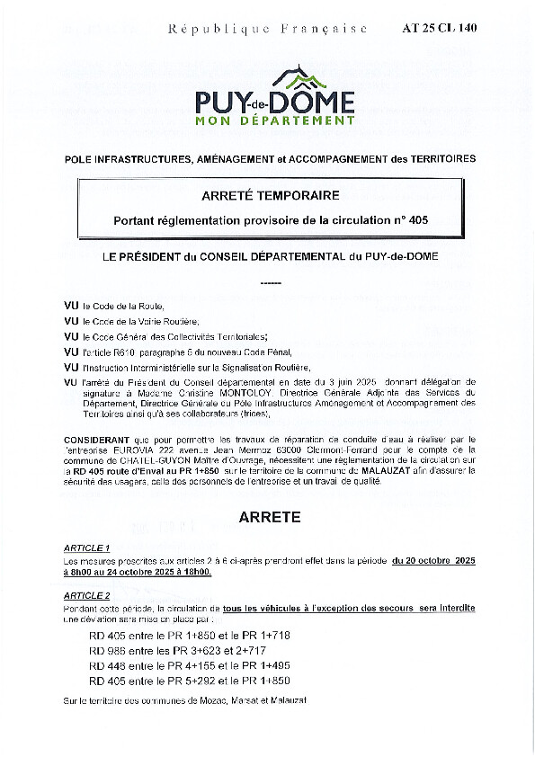 Arrêté de circulation avec déviation sur la commune de Malauzat