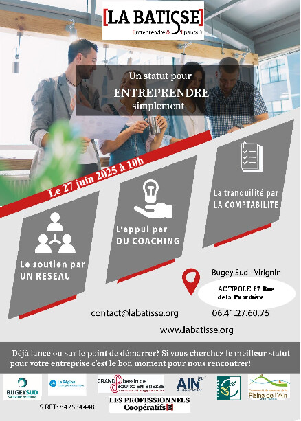 Dans le cadre de nos actions dâanimation auprĂšs des porteurs de projet, nous vous informons quâune deuxiĂšme sĂ©ance dâinformation collective est organisĂ©e par notre partenaire Ă©conomique LA BATISSE (CoopĂ©rative dâActivitĂ©s et dâEmplois) :