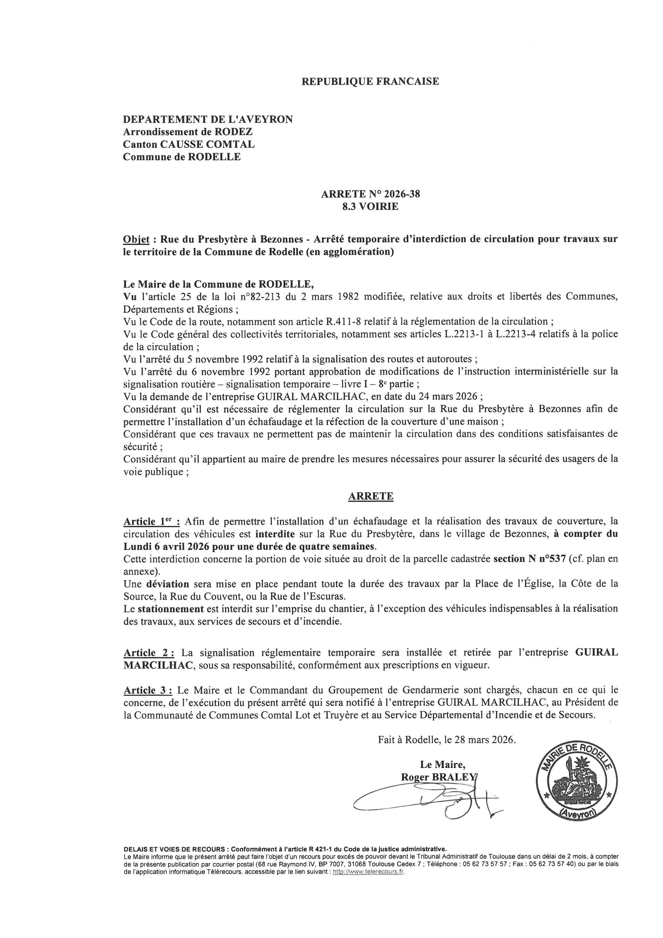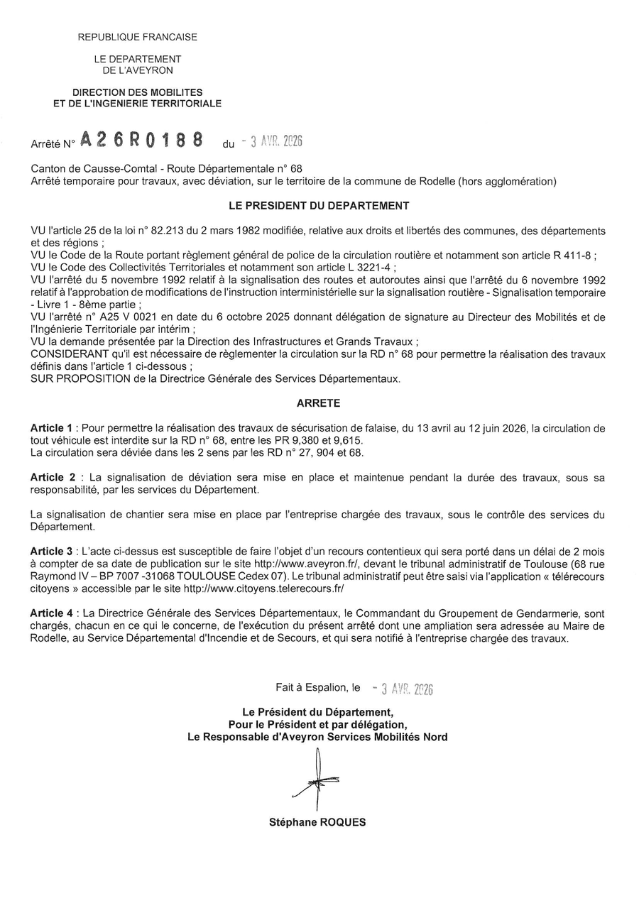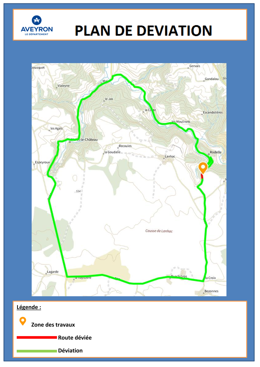 Circulation interdite pendant 2 mois à compter du 13 avril, sur la RD 68 dans la descente de Rodelle, en raison de travaux de sécurisation de la falaise