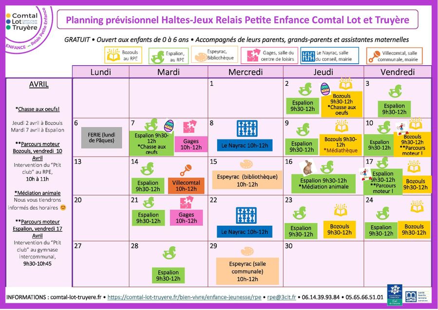 Planning du mois d'avril des haltes-jeux pour les enfants jusqu'à 6 ans, organisées par le Relais Petite Enfance de la Communauté de Communes Comtal, Lot et Truyère.