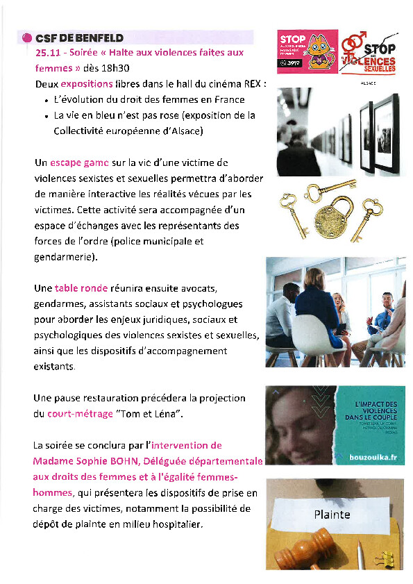 Das le cadre de ces temps d’informations et d’échanges plusieurs partenaires seront présents, notamment la présidente de l’association SOSfemmessolidarités67, madame LOUISADAT, mais aussi, la déléguée départementale des droits des femmes Madame BOHN Sophie.