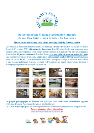 Depuis le 1er Octobre 2025, la Maison d'Assistants Maternels Baby’s Fontaines a ouvert ses portes l à Beaulieu les Fontaines.
