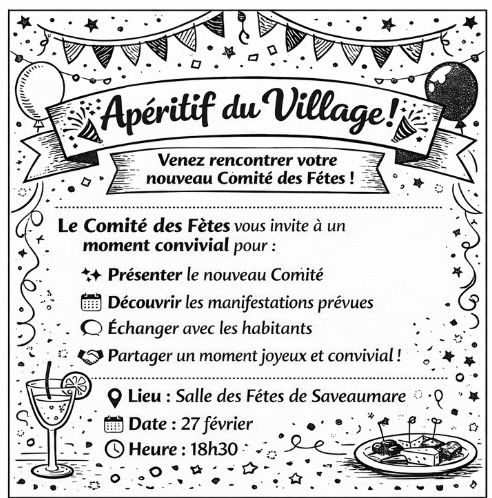 Le 27 février, dans la foulée de l'assemblée générale des Tamalou, le nouveau Comité des Fêtes vous propose à partir de 18h30 (salle de saveaumare) un apéritif de présentation de l'équipe et des manifestations à venir.