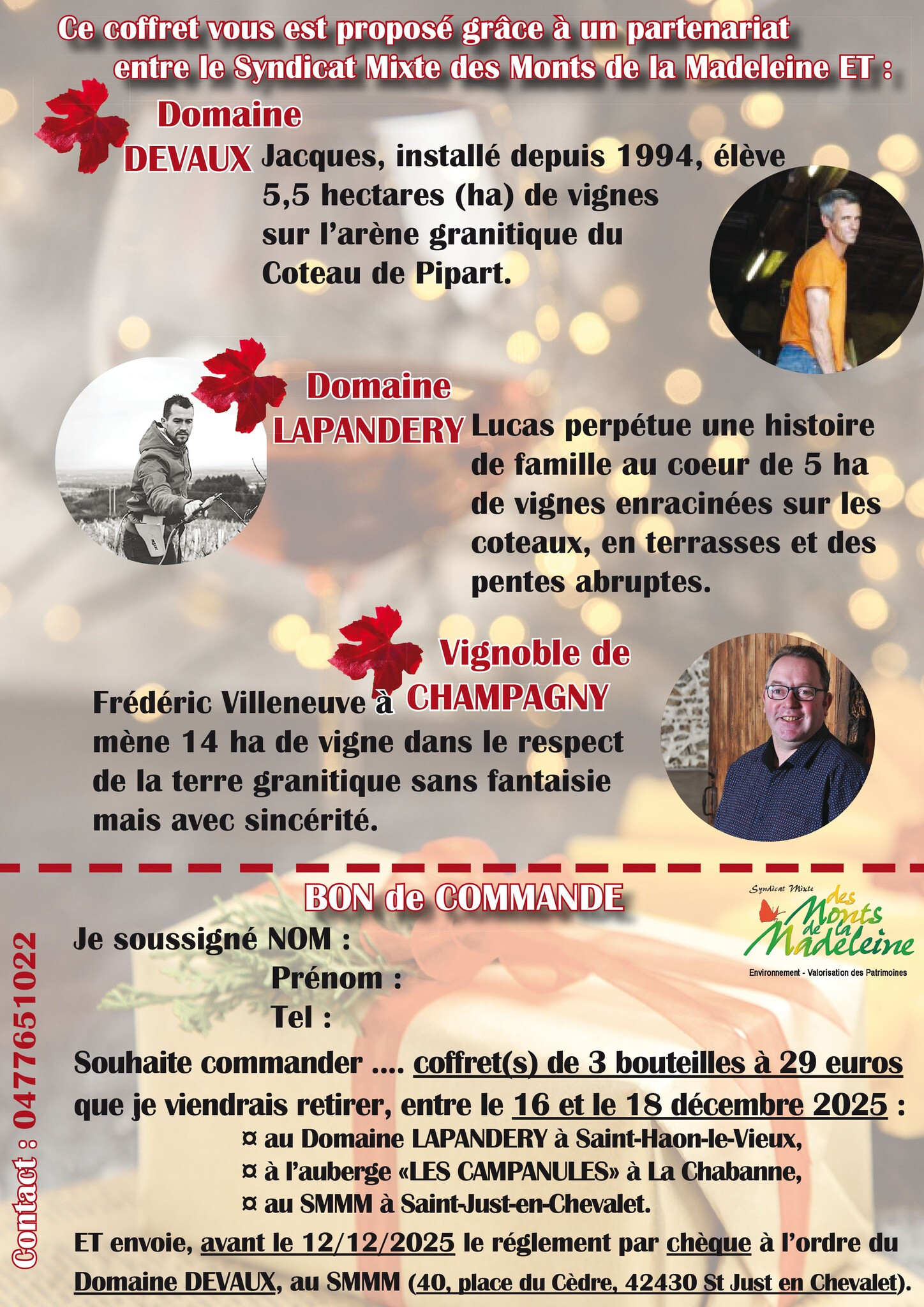 A l’approche des fêtes, le SMMM lance une quinzaine commerciale en partenariat avec 3 vignerons de Saint-Haon-le-Vieux, pour un beau coffret de vins produits en Côte Roannaise (voir pièce jointe)