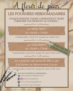 Les fournées reprennent les mercredis et vendredis de 15h30 à 17h30. Bonne nouvelle pour les gourmands : les petits pains "Cacao et chocolat noir" seront finalement disponibles à la commande tout l'hiver !