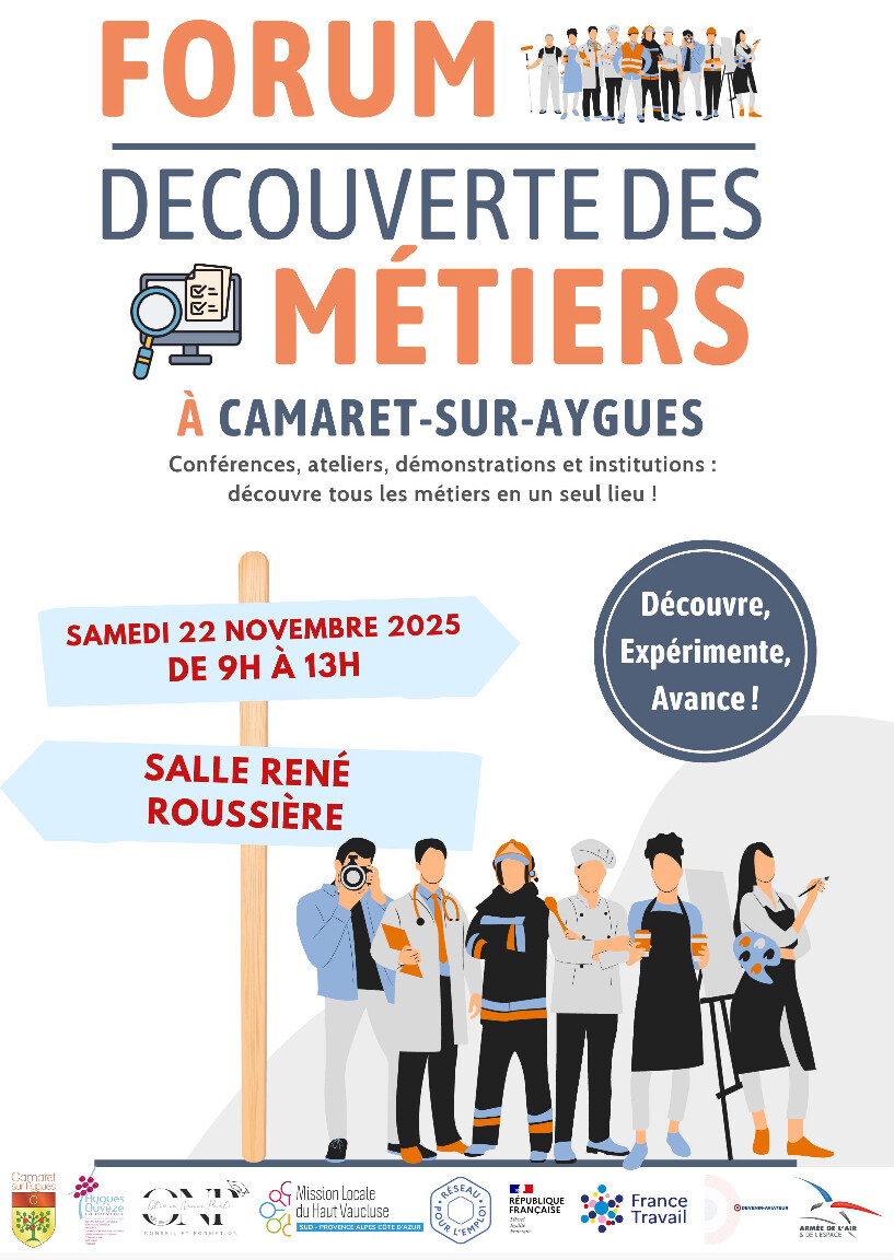 La ville de Camaret-sur-Aygues et ONP Conseil et Formation, en coopération avec de nombreux partenaires, organisent la seconde édition du Forum des métiers le samedi 22 novembre 2025, de 9h00 à 13h00 à la salle René Roussière.