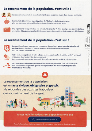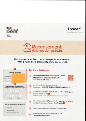 Nous vous informons qu'à compter d'aujourd'hui le (15 janvier 2025), notre agent recenseur va déposer entre le 15 et le 16 janvier 2026 dans votre boîte aux lettres la notice internet avec vos identifiants.