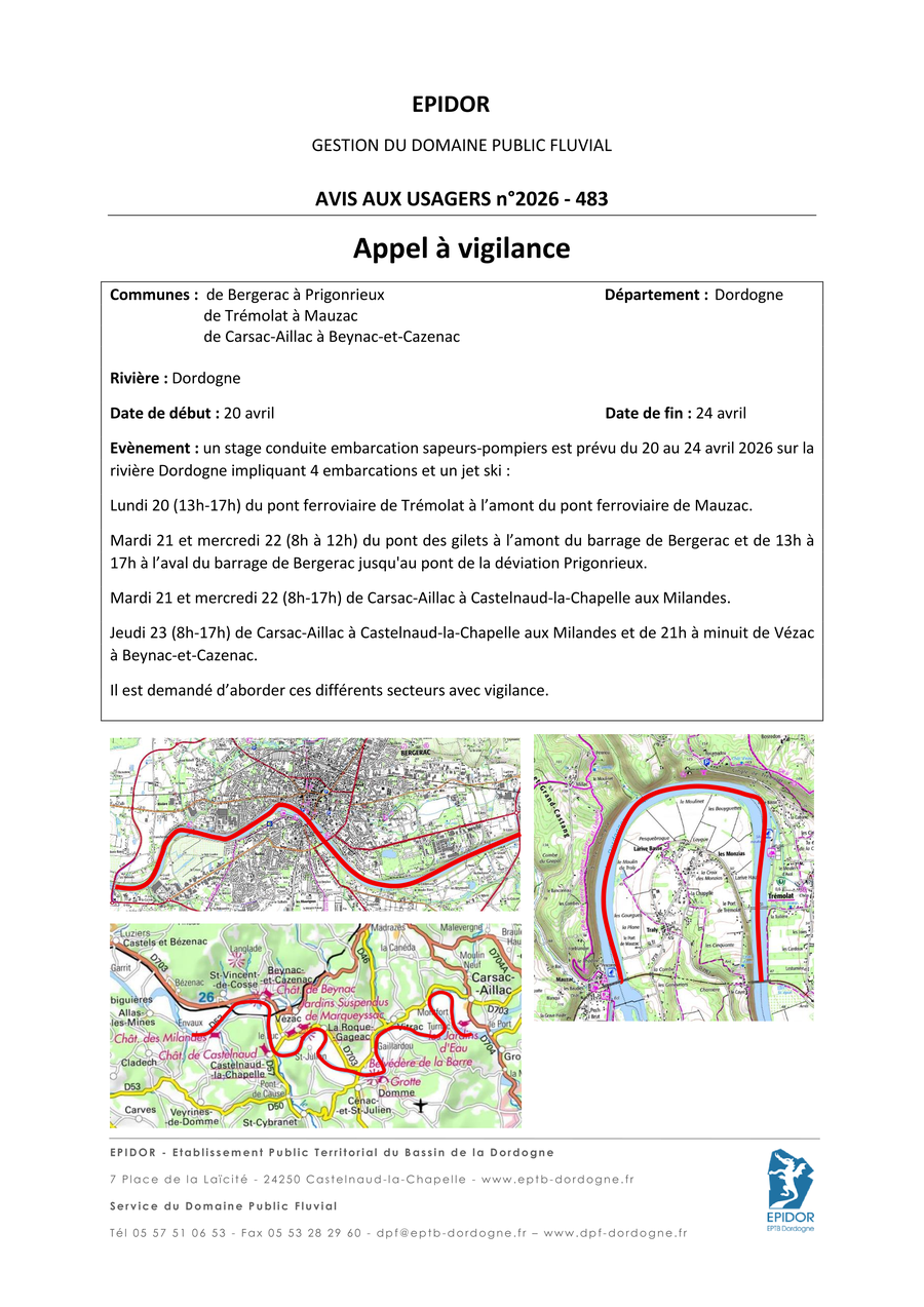 un stage conduite embarcation sapeurs-pompiers est prévu du 20 au 24 avril 2026 sur la rivière Dordogne impliquant 4 embarcations et un jet ski :