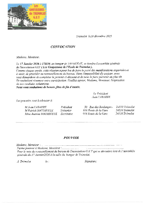 Les réservations sont ouvertes ! Envie de passer à 2026 dans la joie et la bonne humeur? N'hésitez plus le Comité des fêtes trémolat vous accueillera à la salle des fêtes du Grenier à Trémolat le 31/12/2025 à partir de 20h