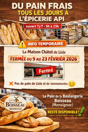 La boulangerie Châtel de Lisle sera fermée du 9 au 23 février 2026. Durant cette période, il n’y aura ni pain de Lisle ni viennoiseries.