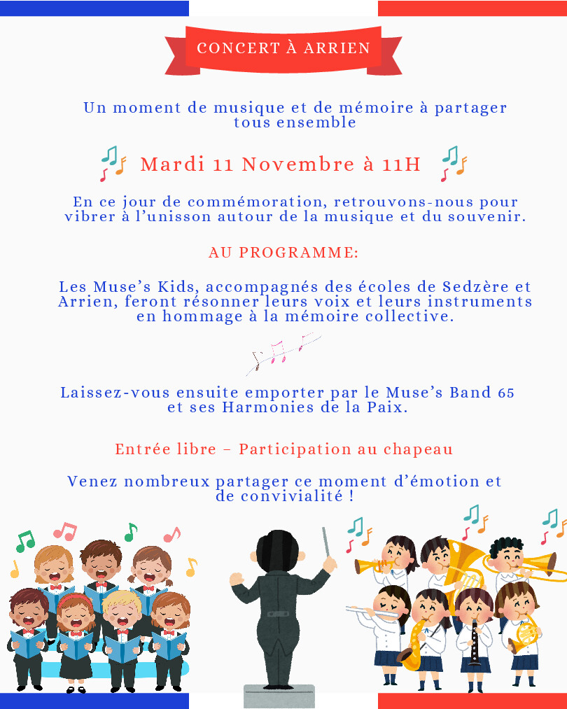La cérémonie de commémoration du 11 novembre se déroulera au monument aux morts d’Arrien à 11 heures. La Marseillaise sera chantée par les enfants de l’école accompagnés par le Muse’s Kids.