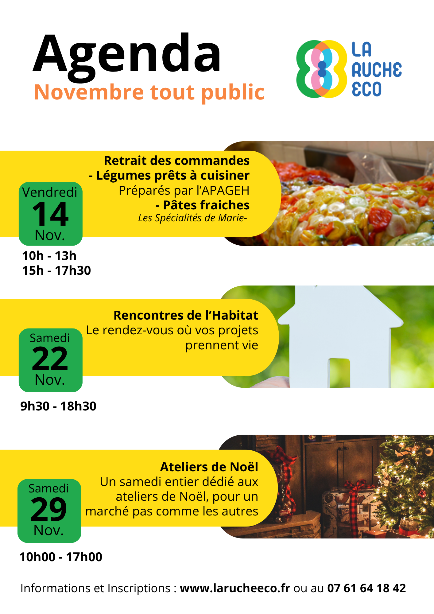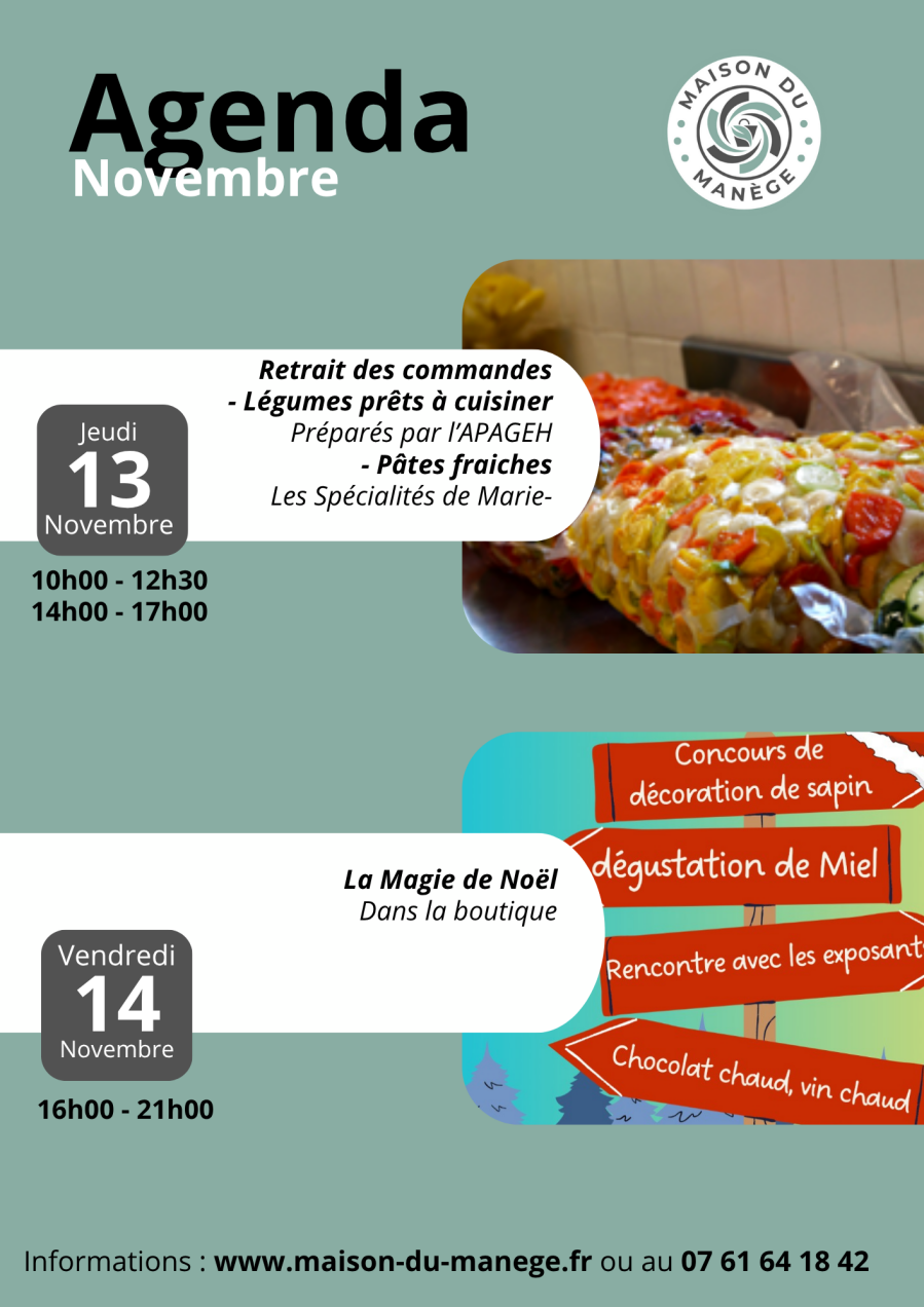 🗓️ Le vendredi 14 novembre, de 10h à 13h puis de 15h0 à 17h30 : Retrait des commandes de légumes prêts à cuisiner préparés par l’APAGEH et des pâtes fraiches préparées par les Spécialités de Marie - sur commande avant le 07/11