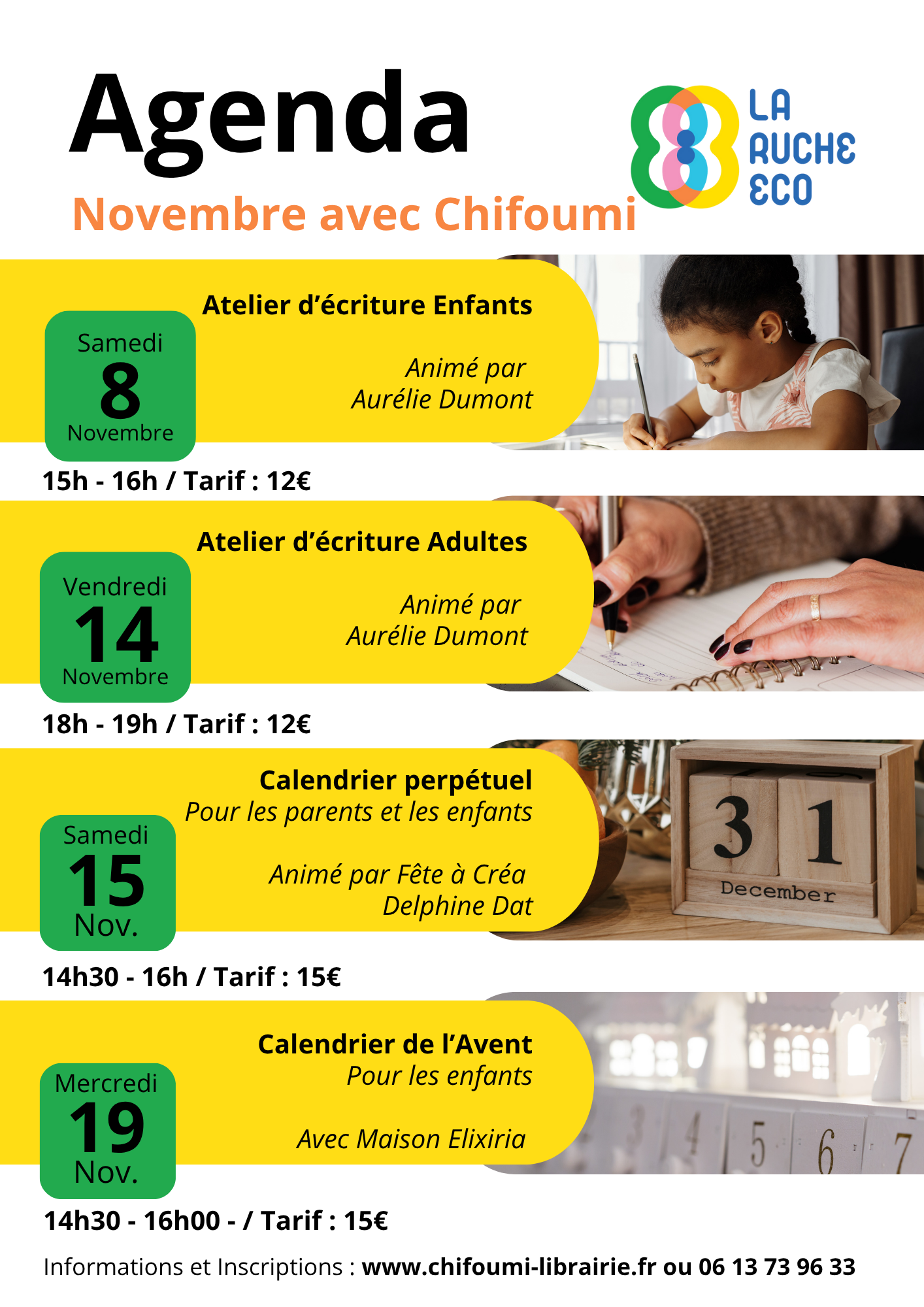🗓️ Le vendredi 14 novembre, de 18h00 à 19h00, Atelier d’écriture Adultes. Animé par Aurélie Dumont. Tarif 12€