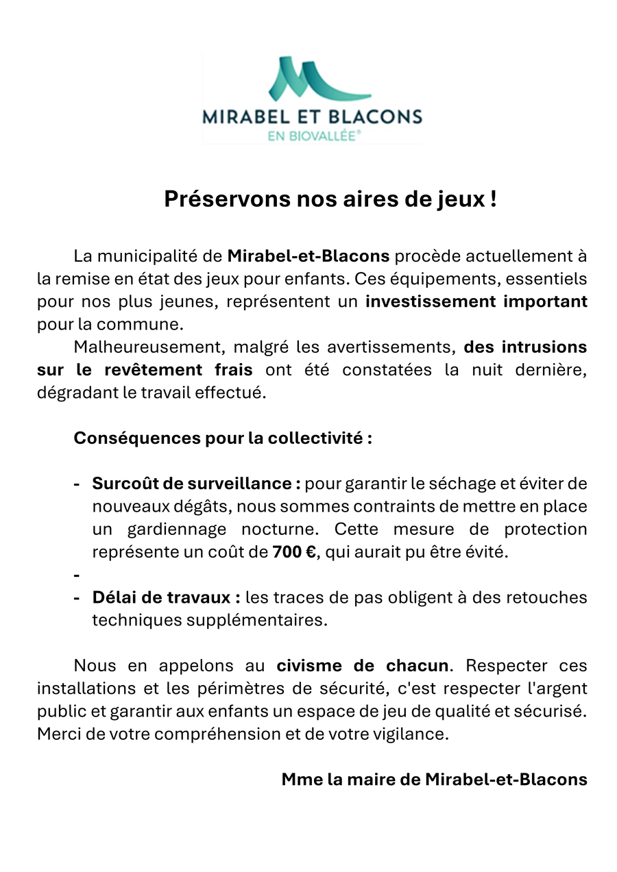 Ci-joint un communiqué de Mme la maire pour mettre en alerte contre les incivilités dans le village