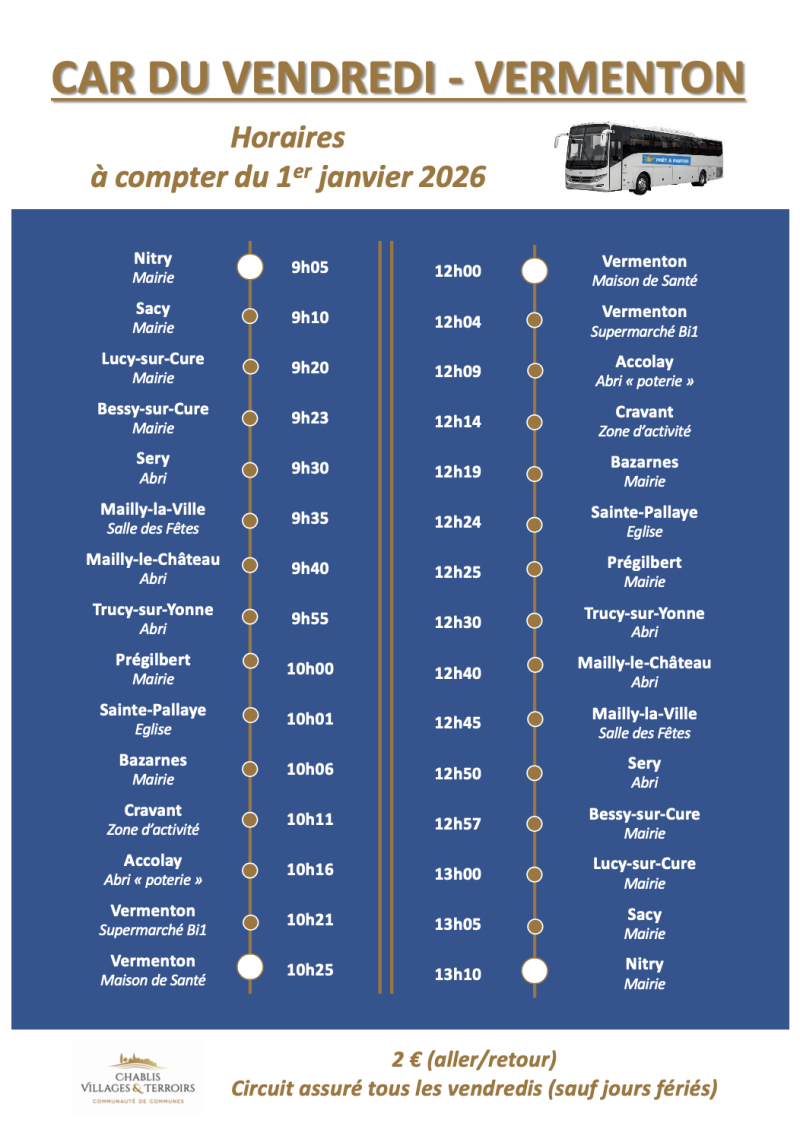 Chaque vendredi matin (sauf jour férié), un bus permettra toujours aux habitants du sud du territoire de se rendre à Vermenton pour leurs démarches et achats du quotidien : maison de santé, pharmacie, marché, commerces, etc…