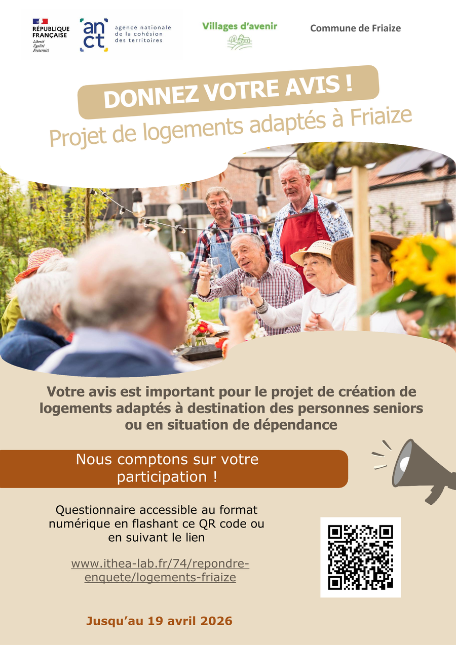 La commune de Friaize souhaite connaître vos besoins pour envisager la création de logements adaptés à destination des personnes seniors ou en situation de dépendance. Votre avis est important, merci beaucoup pour votre contribution !