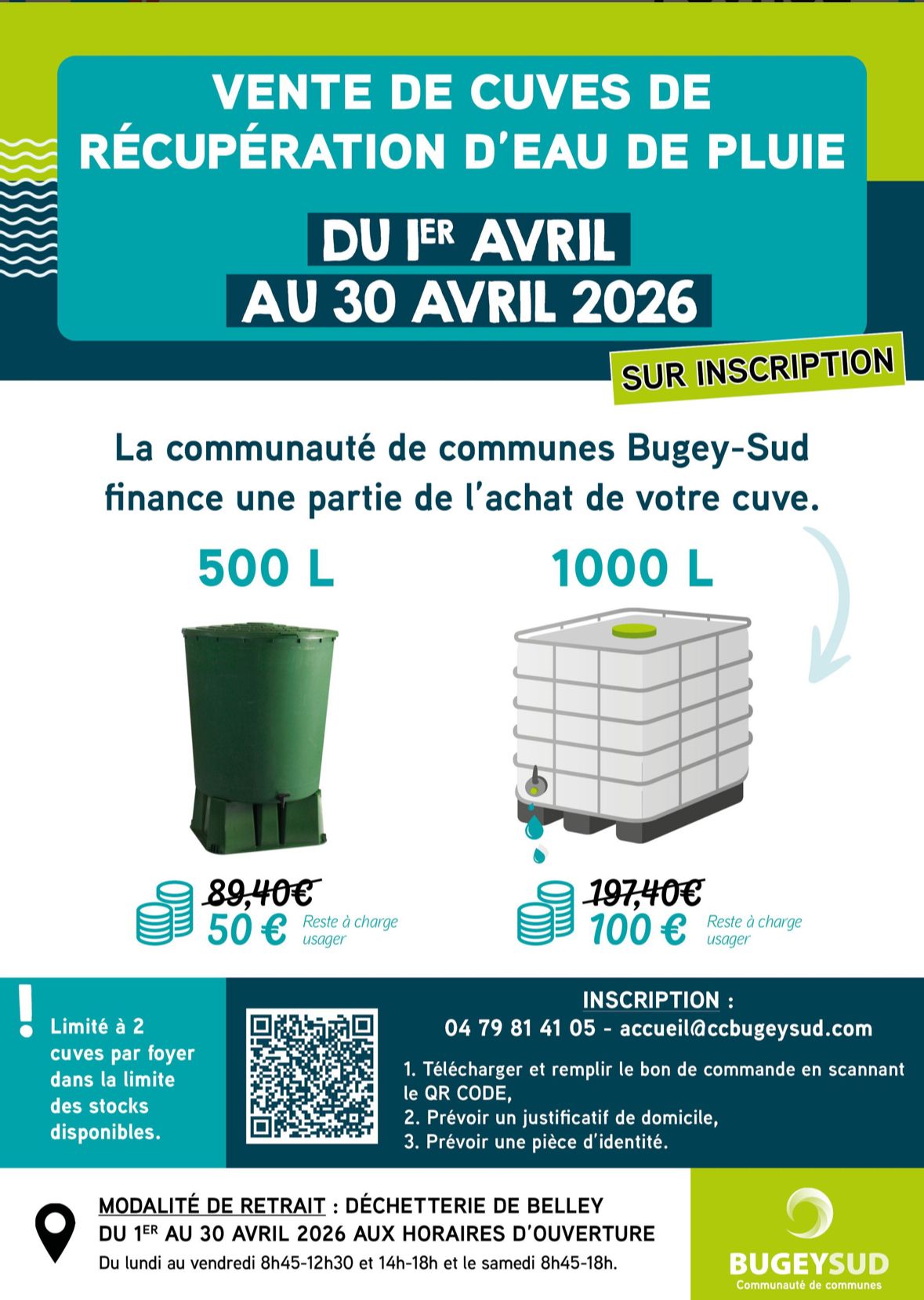 Les cuves seront Ă rĂ©cupĂ©rer Ă la dĂ©chetterie de Belley du 1er au 30 avril 2026 aux horaires dâouverture du lundi au vendredi : 8h45 â 12h30 / 14h â 18h et samedi : 8h45 â 18h