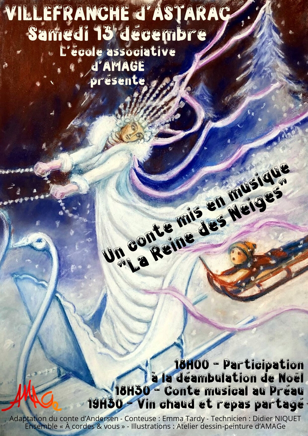 Cette année l'équipe "décoration de Noël" s'allie à Amage pour offrir une déambulation en musique dans les rues du village suivi d'un spectacle au Préau sous forme de Conte musical et terminé par un vin chaud offert accompagné de gourmandises apportées par chacun.