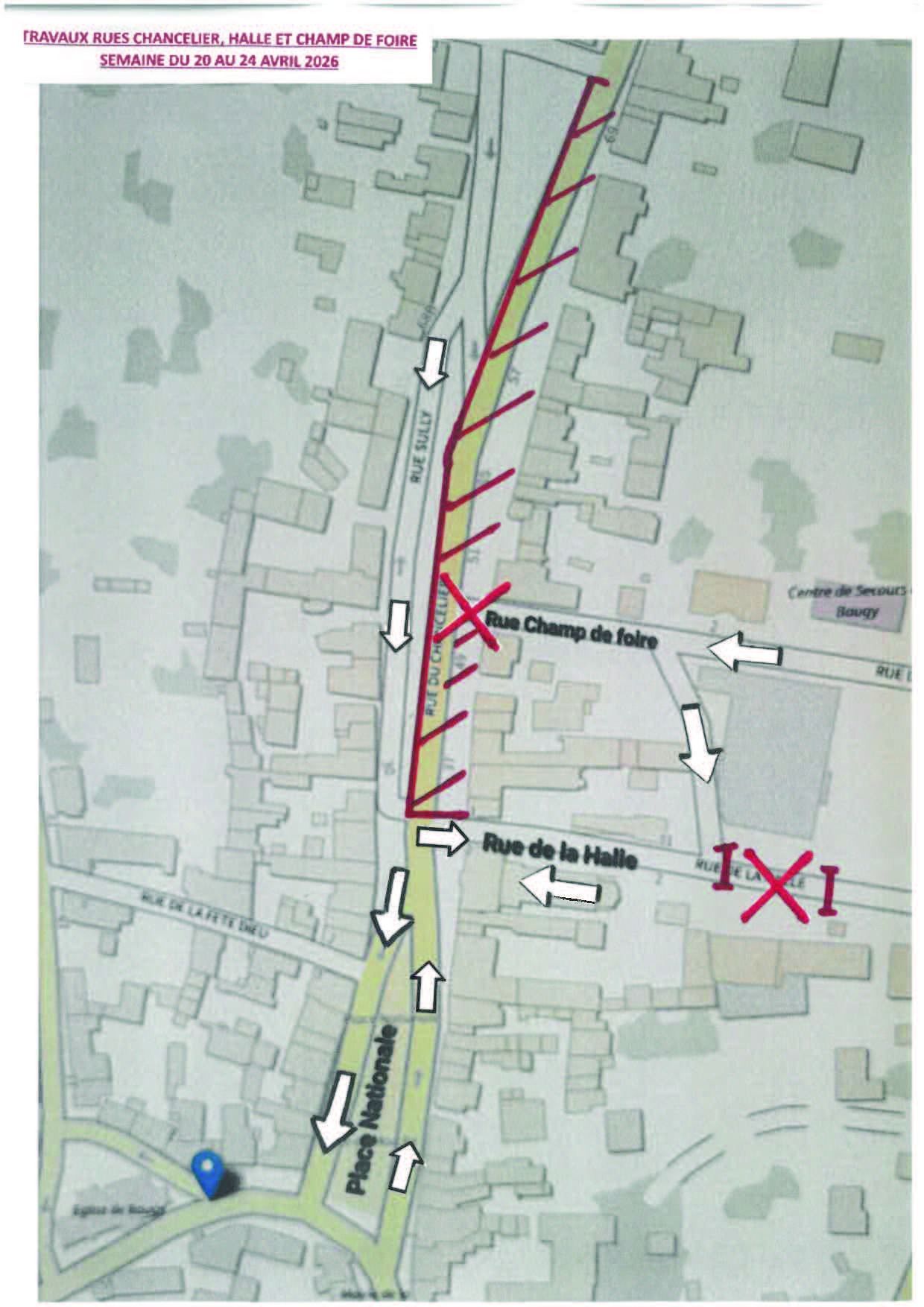 ↦ Une portion de rue de la Halle (entre le supermarché Super U et la boutique Plus que du Vin) sera interdite à la circulation.
