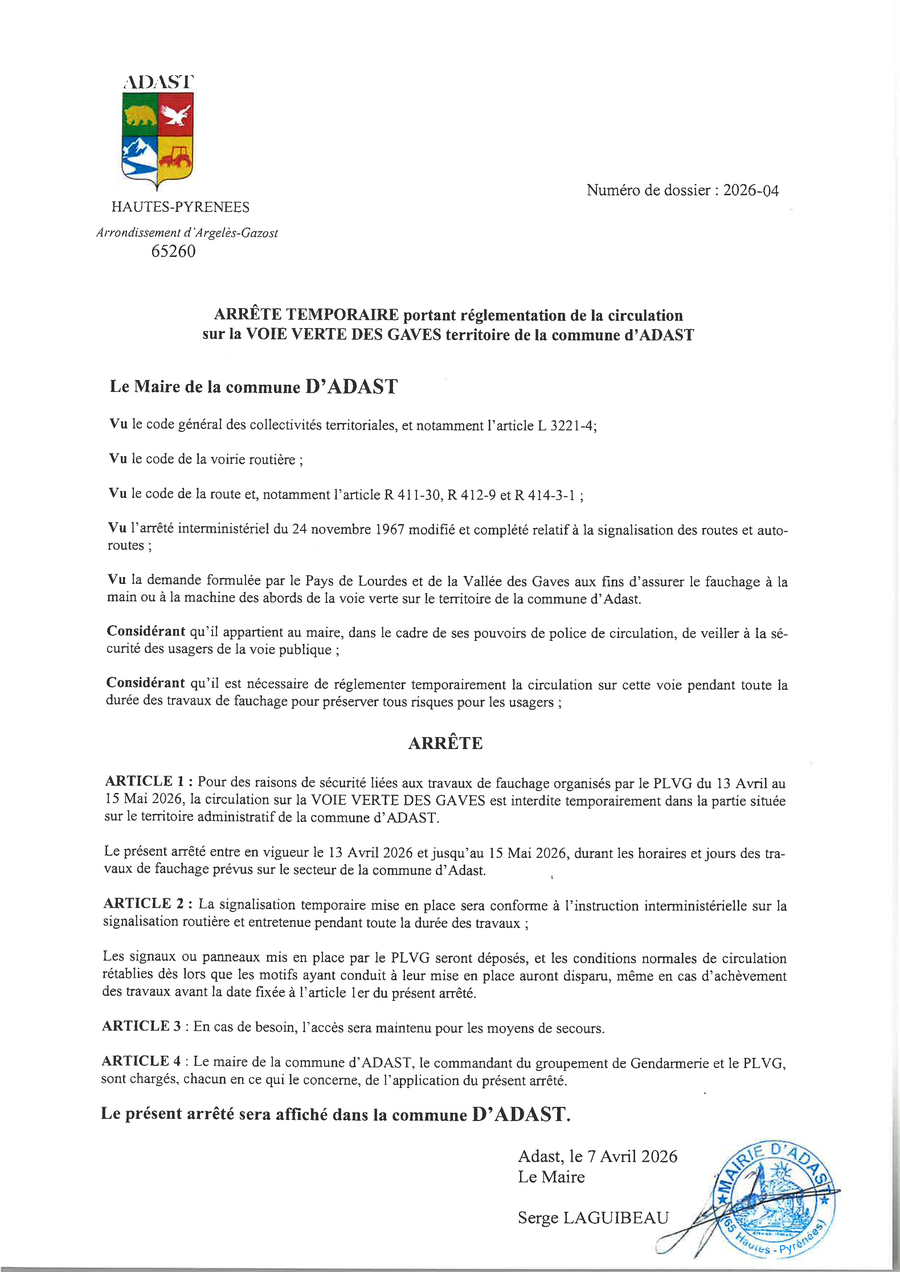 Pour des raisons de sécurité liées aux travaux de fauchages organisés par le PLVG, du 13 avril au 15 mai 2026, la circulation sur la voie verte des Gaves sera temporairement interdite les jours des travaux.