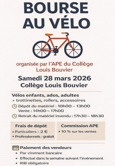 L’Association des Parents d’Élèves du collège Louis Bouvier organise une bourse aux vélos, samedi 28 mars au collège Louis Bouvier à Saint-Laurent.