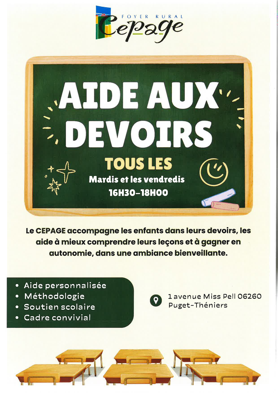 - l'aide aux devoirs les mardis et vendredis de 16h à 17h30 pendant les périodes scolaires de septembre à juin,