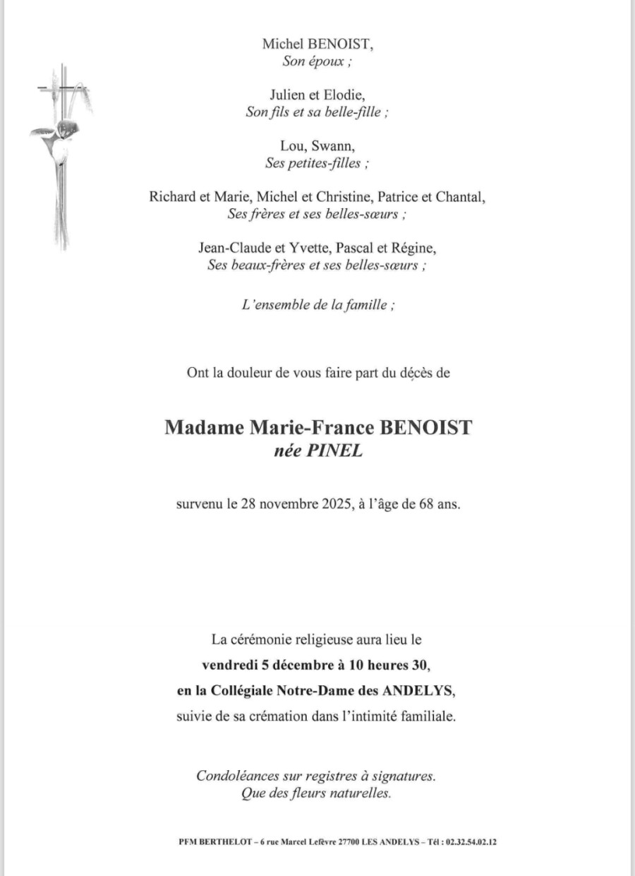 À la demande de la famille, nous vous faisons part du décès de Mme Marie-France BENOIST, domiciliée à Bernières-sur-Seine.