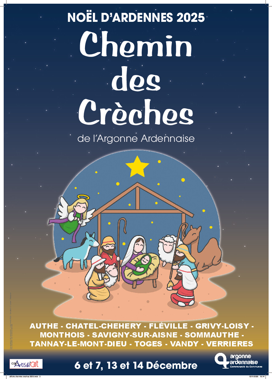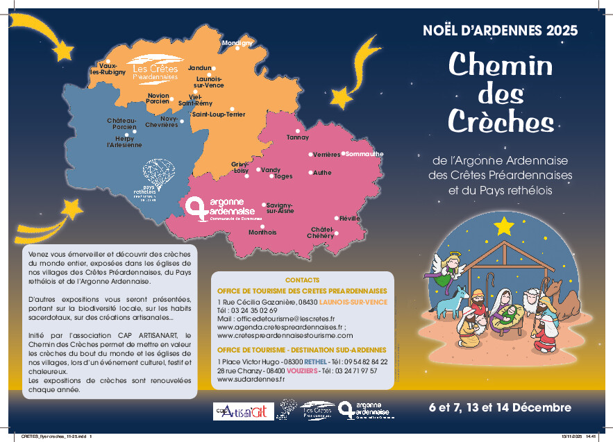 🔸 Découvrez le programme du Chemin des Crèches 2025, initié par l’association Cap Artisan’Art, et laissez-vous émerveiller par des crèches du monde entier exposées dans 11 églises de l’Argonne Ardennaise !