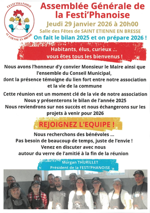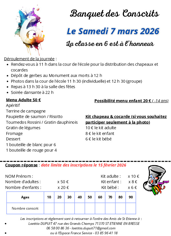 Le banquet des Conscrits de la Classe en 6 de St Étienne en Bresse aura lieu le Samedi 07 Mars 2026 !