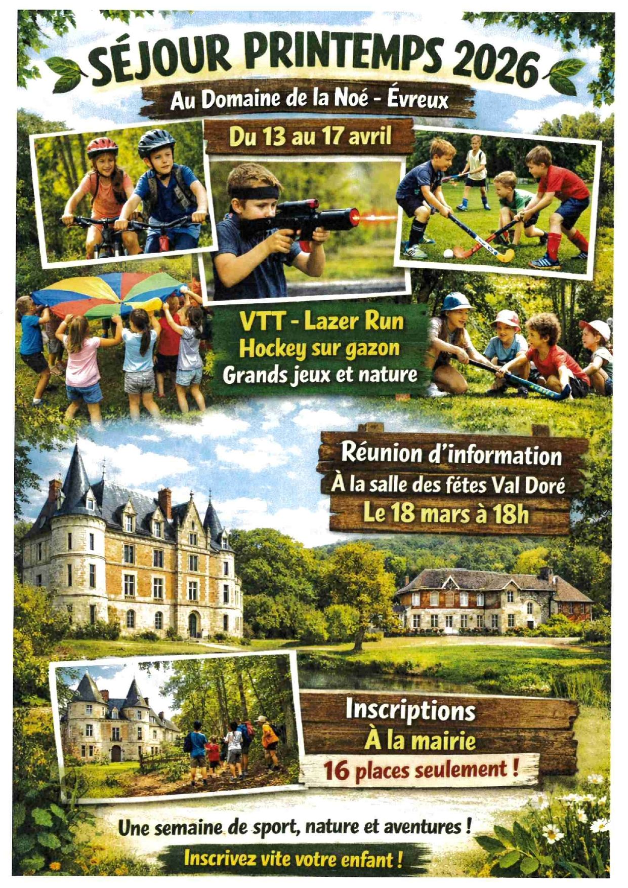 Comme chaque année, la municipalité organise le séjour des vacances de printemps du 13 au 17 avril pour les enfants de 8 à 12 ans. Le séjour prendra place au domaine de la Noé, près d'Evreux.