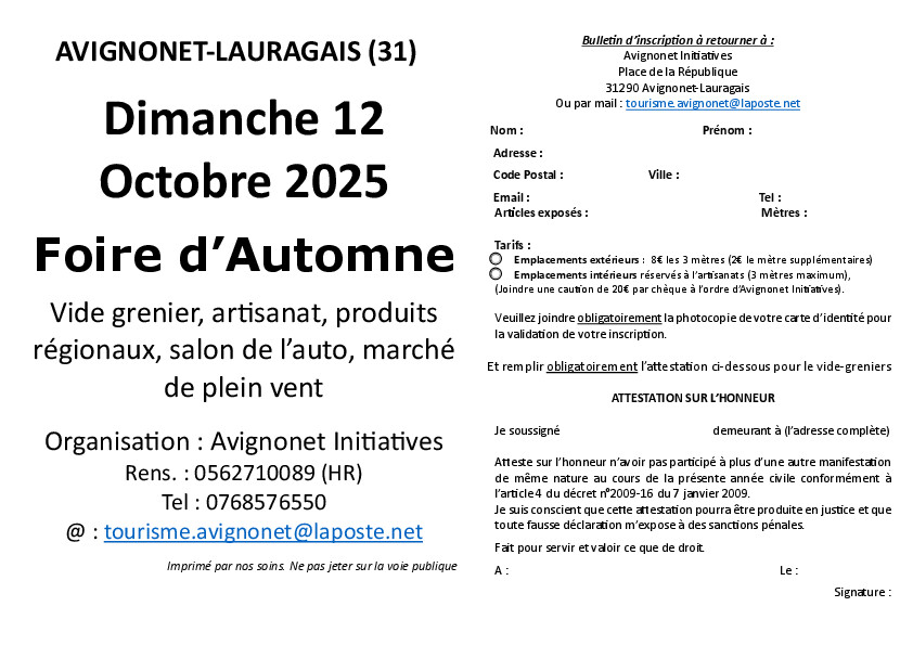 Il est encore temps de s'inscrire pour la foire d'automne 2025 organisée par Avignonet Initiatives le dimanche 12 octobre.