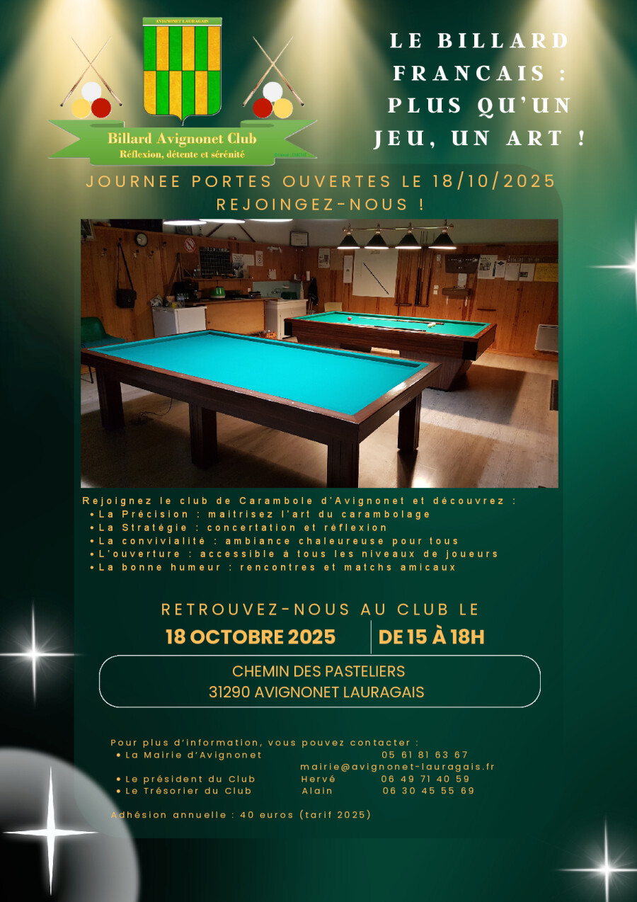 Le club de billard organisera une animation le 18 octobre prochain et à cette occasion souhaite ouvrir ses portes à toutes personnes curieuses et/ou prévoyant d'adhérer.