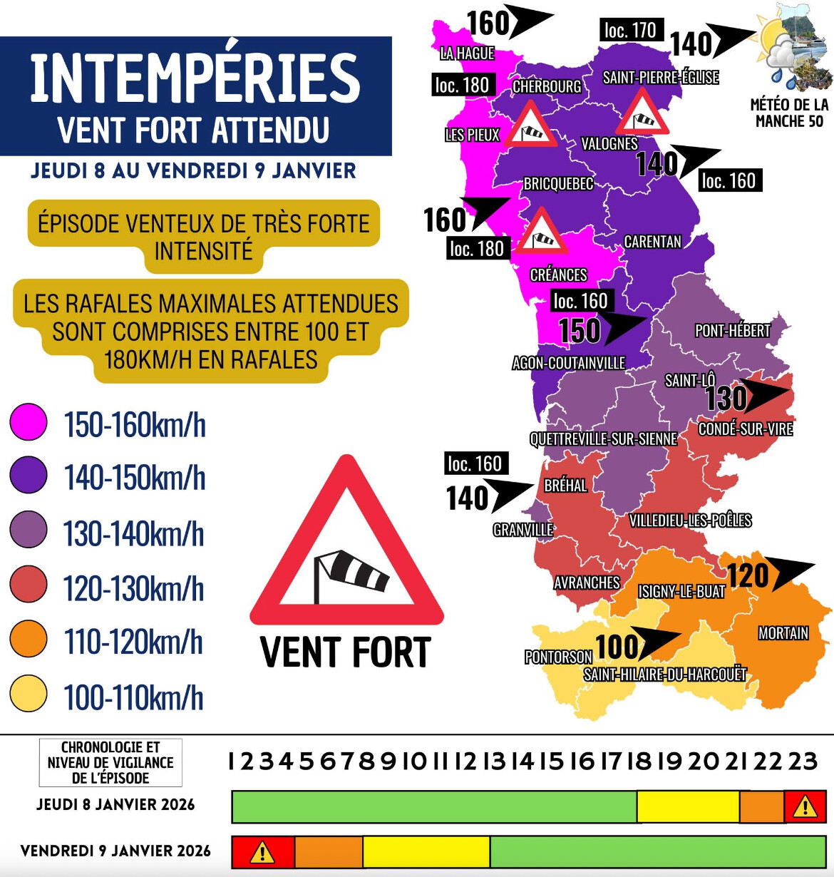 Dans son bulletin de 6h, Météo France a placé le département de la Manche en vigilance rouge « vents violents » aujourd’hui, jeudi 8 janvier, de 21h à 3h. La vigilance passera ensuite en orange jusqu'à vendredi matin, 6h.