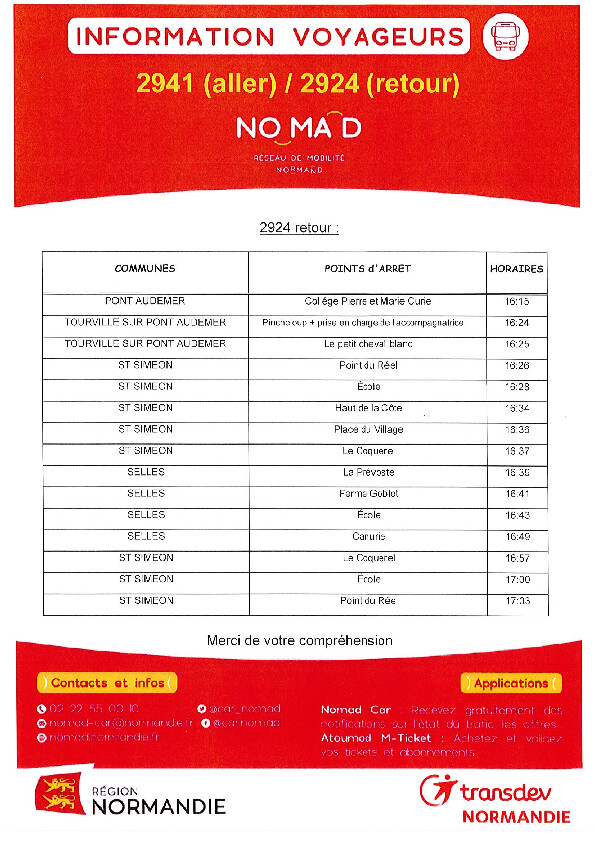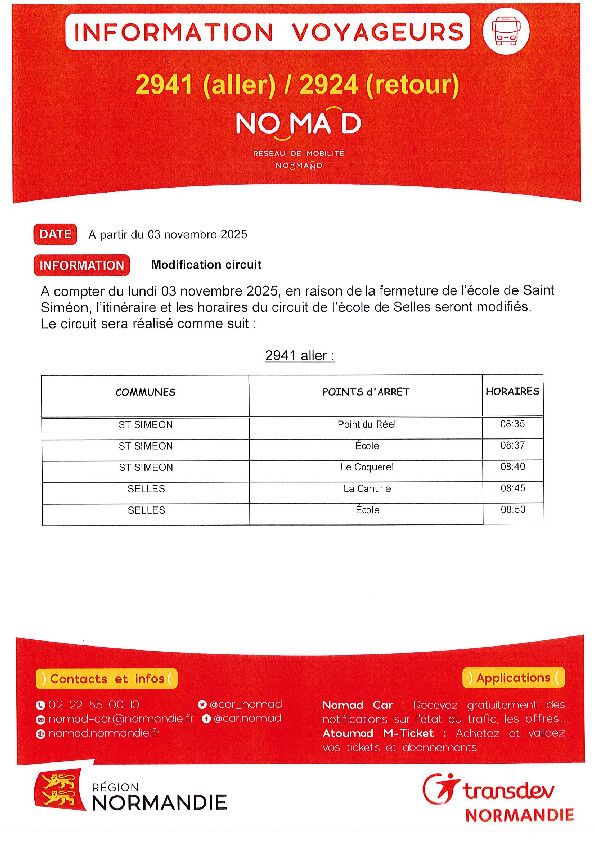 l'itinéraire et les horaires du circuit de l'école de Selles seront modifiés.