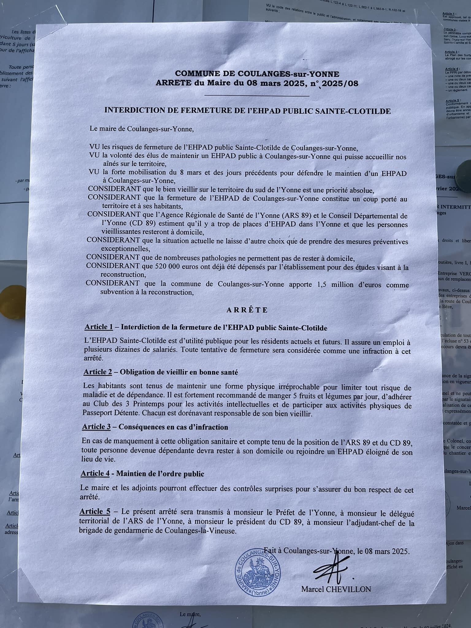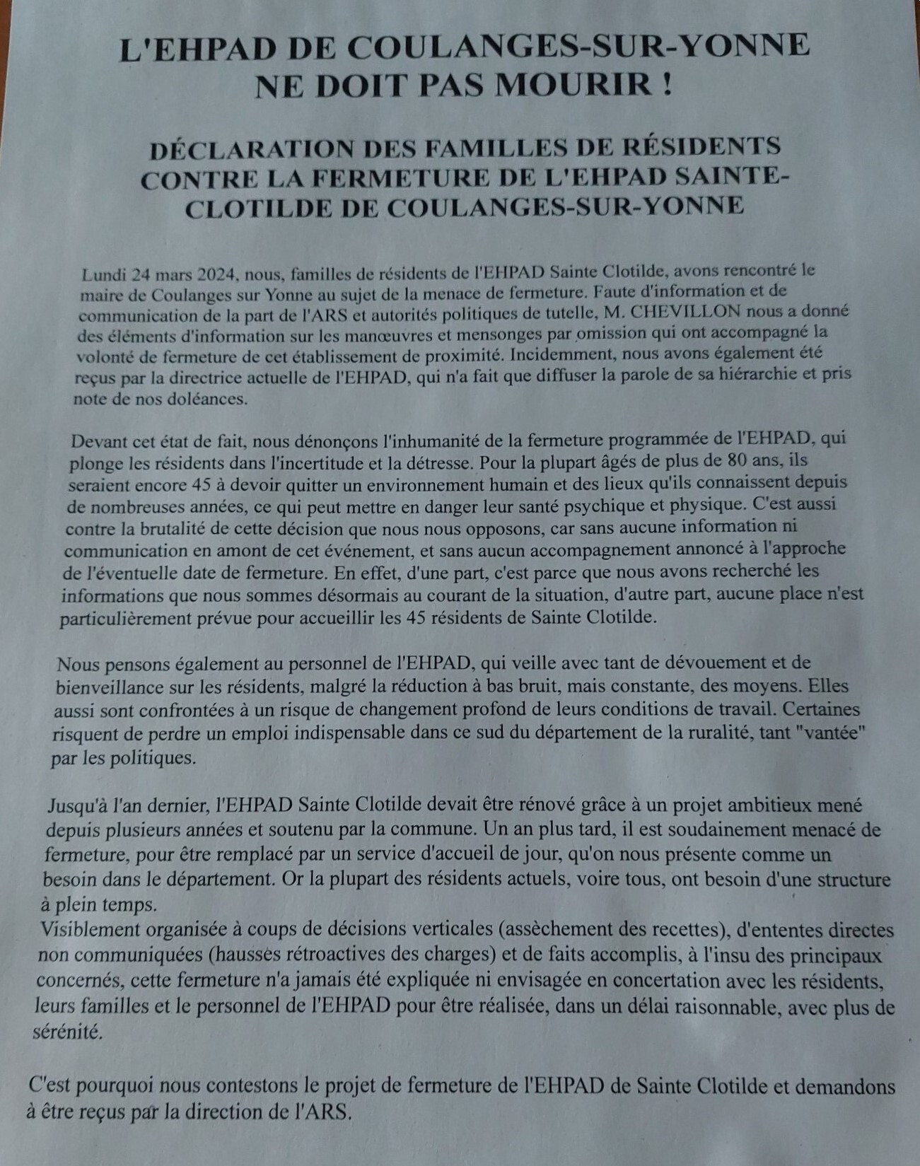 Comme maire de Coulanges-sur-Yonne et président du conseil d'administration de l'EHPAD, je n'ai cessé de rappeler ma détermination à mener le combat pour la résidence Sainte-Clotilde.