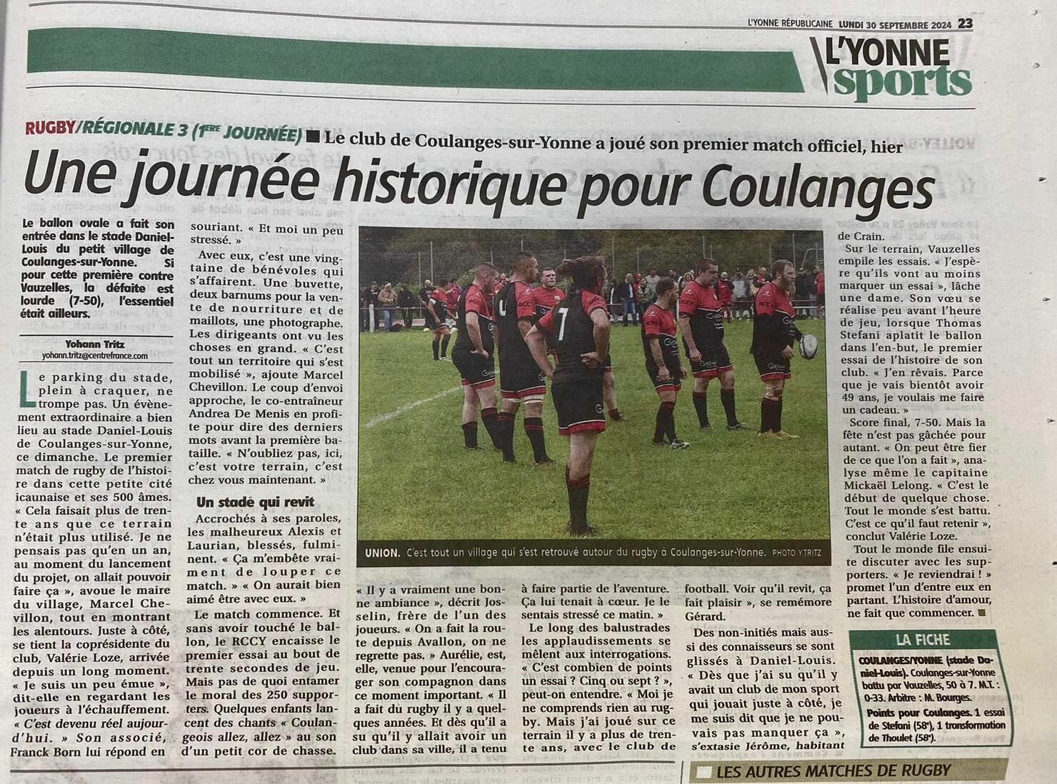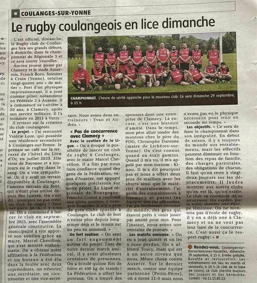 Même si le score peut paraître sévère, l'essentiel est ailleurs. Le Rugby Club de Coulanges-sur-Yonne a montré son engagement et sa détermination en championnat, un an presque jour pour jour après son assemblée constitutive. Il y aura certainement des résultats plus équilibrés lors des prochains matchs mais ce jour reste historique. Le dernier match de foot sur ce terrain remonte à plus de 30 ans. Créer une équipe de rugby sur notre territoire relève de l'exploit et c'est bien ce que je retiens de cette belle journée où le public a répondu présent.