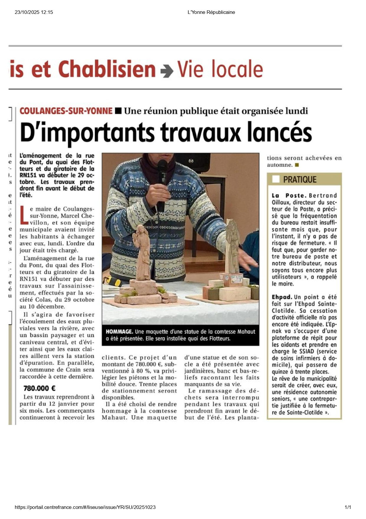 Suite à la réunion publique qui s'est tenue lundi 20 octobre, l'Yonne Républicaine a publié aujourd'hui, jeudi 23 octobre, un article relatant les importants travaux qui vont commencer le 29 octobre dans la commune.