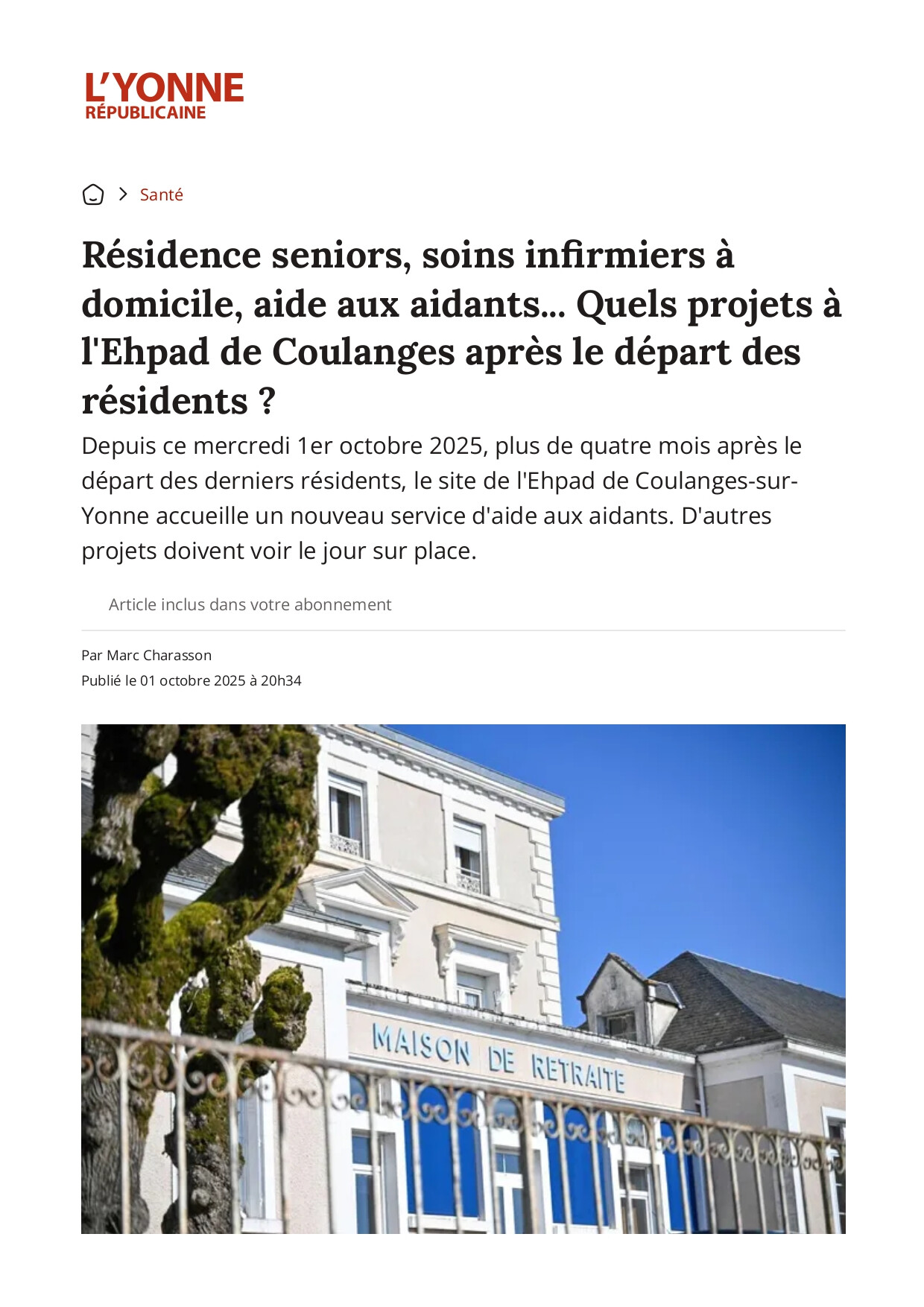 Mercredi 1er octobre, l'Yonne Républicaine a publié sur son site un article sur la situation de l'EHPAD public Sainte-Clotilde.