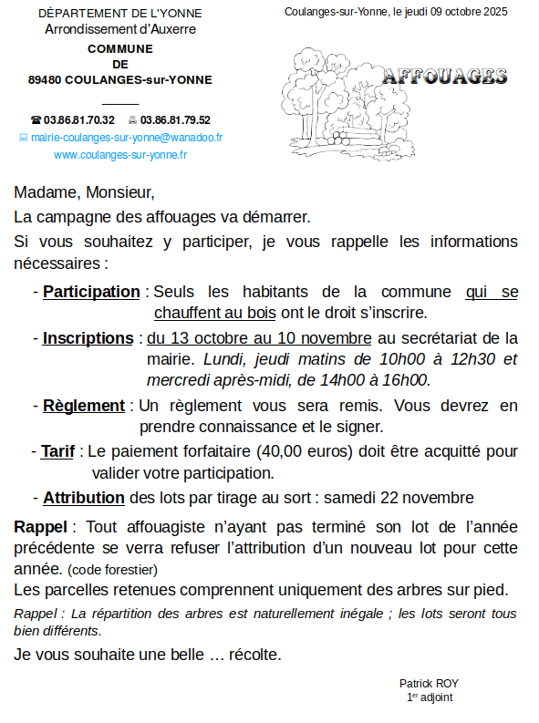 Les 15 et 22 mars 2026, auront lieu les élections municipales à Coulanges-sur-Yonne. Vous élirez le conseil municipal qui sera chargé durant 6 ans de régler « par ses délibérations les affaires de la commune » (article L 2121-29 du Code Général des Collectivités Territoriales). Le conseil municipal (composé des conseillers municipaux élus) se réunira ensuite pour élire, en son sein, un maire et un ou plusieurs adjoints.