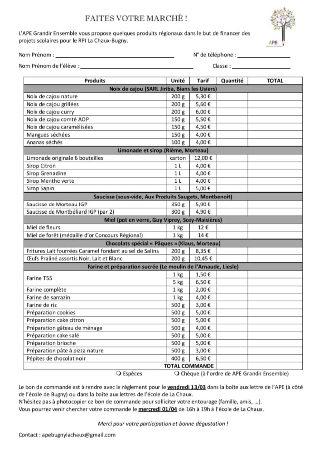 L'APE Grandir Ensemble vous propose une vente de produits régionaux toujours dans le but de financer des projets dans nos 2 écoles. Voici le bon de commande. N'hésitez pas, ce ne sont que des bons produits ! Commandes à passer avant le 13 Mars.