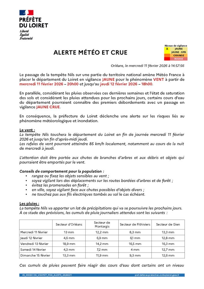 La préfecture du Loiret appelle donc à la vigilance face aux risques liés aux vents violents et aux inondations.
