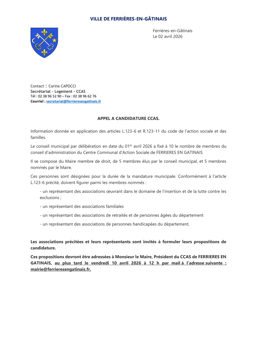 Le Centre Communal d’Action Sociale (CCAS) de Ferrières-en-Gâtinais lance un appel à candidatures auprès des associations souhaitant être représentées en son sein.