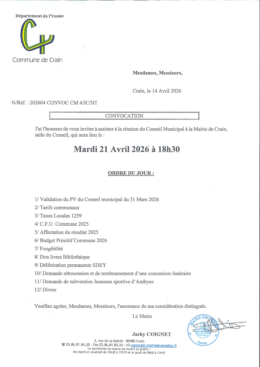 Vous pouvez vous procurer les documents utiles en mairie de Crain ou à la l'espace social des vaux de l'Yonne à :